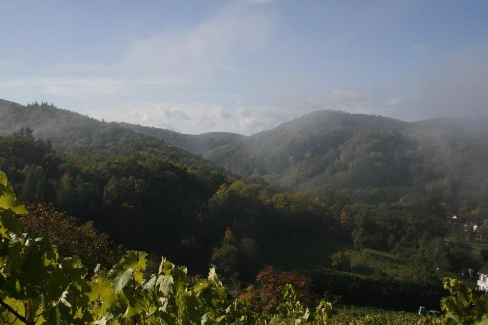 Eine der wenigen erhaltenen Terrassenlagen in Steinbach. Durch die Terrassierung mit Sandsteinmauern wurde der sehr steile Hang in lauter flache Parzellen, sogenannte Schränke, unterteilt. Die Weinbergsmauern heizen sich tagsüber auf und geben auch in der Nacht noch Wärme ab.