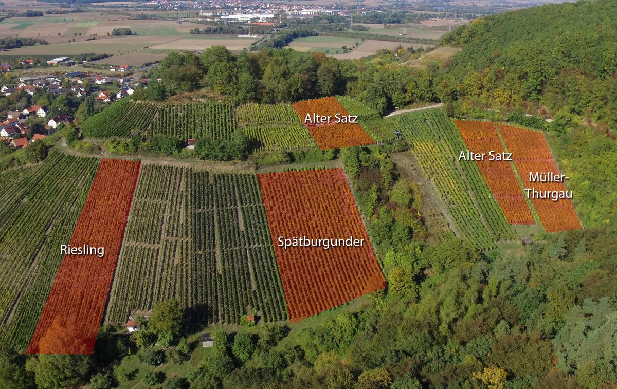 Malerisch schmiegt sich das Örtchen Zell am Ebersberg an den Schloßberg - eine kegelförmige Erhebung, die urkundlich belegt schon 1275 mit Reben bepflanzt wurde. Da Zell einst ein wichtiger Durchgangsort für Reisende war, thronte eine mächtige Burg auf dem Gipfel des Schloßbergs. Heute findet man nur noch Mauerreste von der Burg, die Reben werden aber nach wie vor dort angebaut. Besonders die steile Südlage des aus reinem Keuper bestehenden Schlossberges ist begehrt, daher bauen wir dort unsere Spitzensorten Riesling und Spätburgunder an.