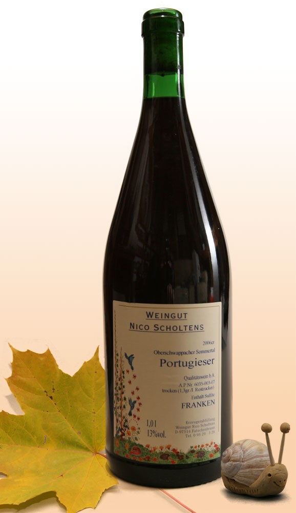 Der fränkische Portugieser gedeiht auf Gipskeuper sehr prächtig. Dort ergibt er einen leichten, milden Schoppenwein von schöner Farbe. Sauber ausgebaut ist der Portugieser ein hervorragender Rotwein und viel besser als sein Ruf. Unser Tip!