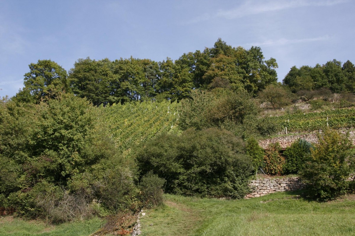 Eine der wenigen erhaltenen Terrassenlagen in Steinbach. Durch die Terrassierung mit Sandsteinmauern wurde der sehr steile Hang in lauter flache Parzellen, sogenannte Schränke, unterteilt. Die Weinbergsmauern heizen sich tagsüber auf und geben auch in der Nacht noch Wärme ab. Terrassenlagen können nur rein von Hand bearbeitet werden und sind daher heutzutage nicht mehr besonders beliebt. Schade - sie sind nämlich nicht nur wunderschön anzuschauen, sondern bringen auch deutlich bessere Weine hervor!
