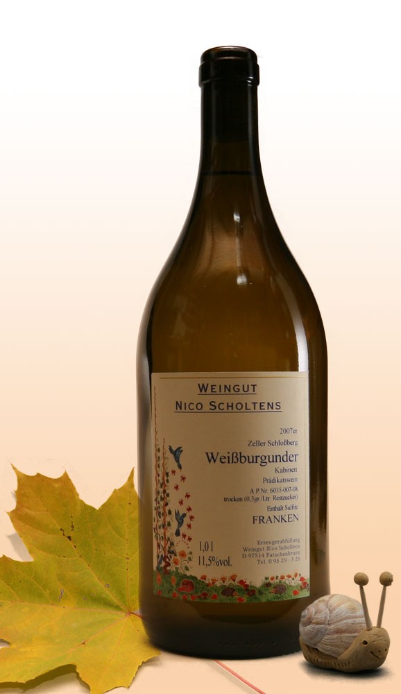Malerisch schmiegt sich das Örtchen Zell am Ebersberg an den Schloßberg - eine kegelförmige Erhebung, die urkundlich belegt schon 1275 mit Reben bepflanzt wurde. Da Zell einst ein wichtiger Durchgangsort für Reisende war, thronte eine mächtige Burg auf dem Gipfel des Schloßbergs. Heute findet man nur noch Mauerreste von der Burg, die Reben werden aber nach wie vor dort angebaut. Besonders die steile Südlage des aus reinem Keuper bestehenden Schlossberges ist begehrt, daher bauen wir dort unsere Spitzensorten Riesling und Spätburgunder an.