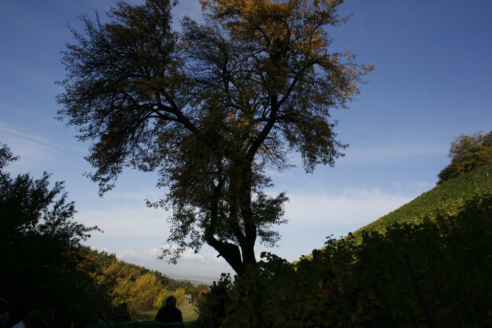 Malerisch schmiegt sich das Örtchen Zell am Ebersberg an den Schloßberg - eine kegelförmige Erhebung, die urkundlich belegt schon 1275 mit Reben bepflanzt wurde. Da Zell einst ein wichtiger Durchgangsort für Reisende war, thronte eine mächtige Burg auf dem Gipfel des Schloßbergs. Heute findet man nur noch Mauerreste von der Burg, die Reben werden aber nach wie vor dort angebaut. Besonders die steile Südlage des aus reinem Keuper bestehenden Schlossberges ist begehrt, daher bauen wir dort unsere Spitzensorten Riesling und Spätburgunder an.