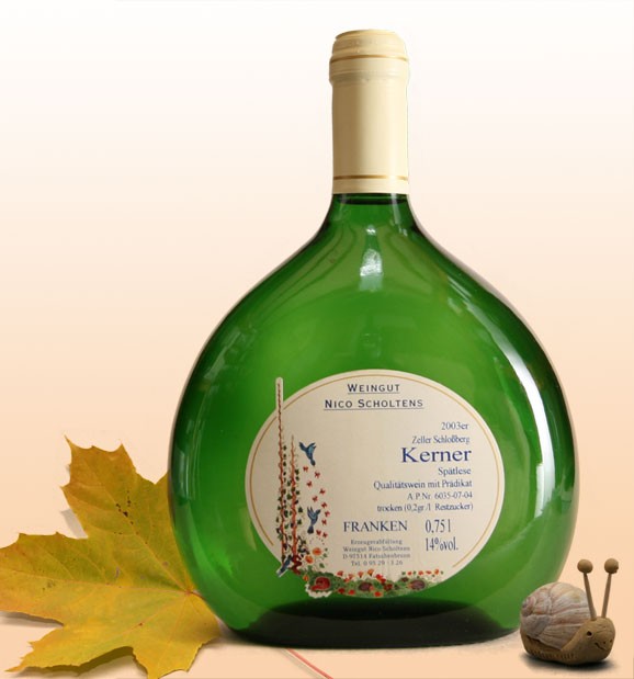 Die Kernerrebe ist eine relativ junge Züchtung aus einer roten “Mutter“ (Trollinger) und einem weißen “Vater“ (Riesling). Ihre dickhäutigen Beeren reifen früh. In Franken beansprucht der Kerner sonnige Standorte und kann dort hohe Mostgewichte erreichen. Die Weine sind kräftig, anregend frisch und mit starken Bukett.