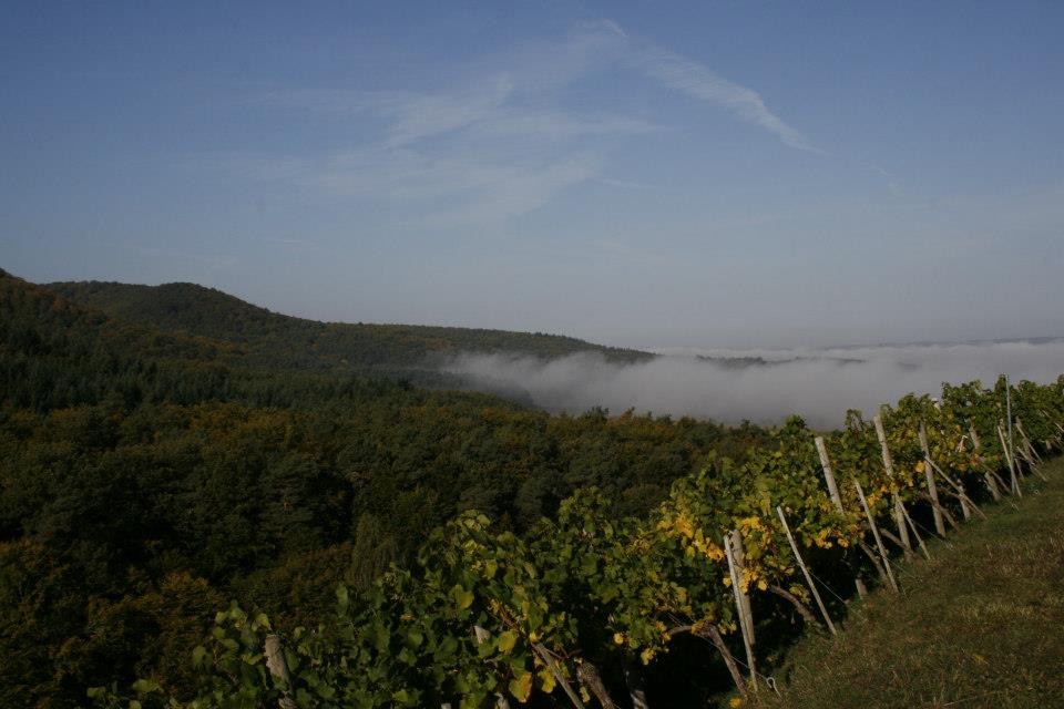 Malerisch schmiegt sich das Örtchen Zell am Ebersberg an den Schloßberg - eine kegelförmige Erhebung, die urkundlich belegt schon 1275 mit Reben bepflanzt wurde. Da Zell einst ein wichtiger Durchgangsort für Reisende war, thronte eine mächtige Burg auf dem Gipfel des Schloßbergs. Heute findet man nur noch Mauerreste von der Burg, die Reben werden aber nach wie vor dort angebaut. Besonders die steile Südlage des aus reinem Keuper bestehenden Schlossberges ist begehrt, daher bauen wir dort unsere Spitzensorten Riesling und Spätburgunder an.