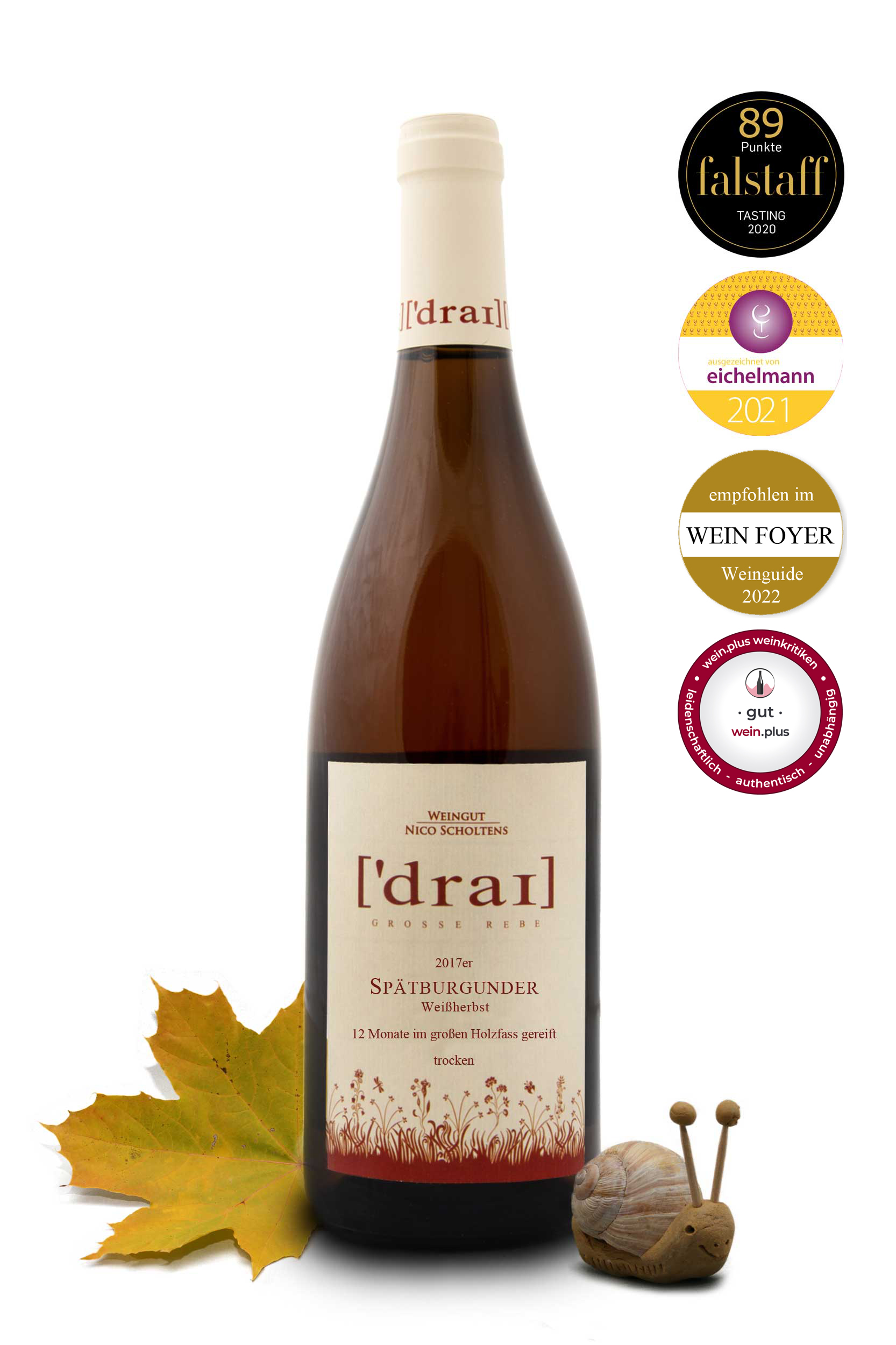 - empfohlen im falstaff Weinguide 2021 - 89 Punkte: "Sehr schöne hellkupferne Farbe, in der Nase weißer Honig, Kapuzienerkresse und Raps, im Mund leicht und saftig, etwas herb und eher nicht der Terrassenwein, sondern schon ein etwas speziell gemachter Wein, dem man Aufmerksamkeit schenken sollte"