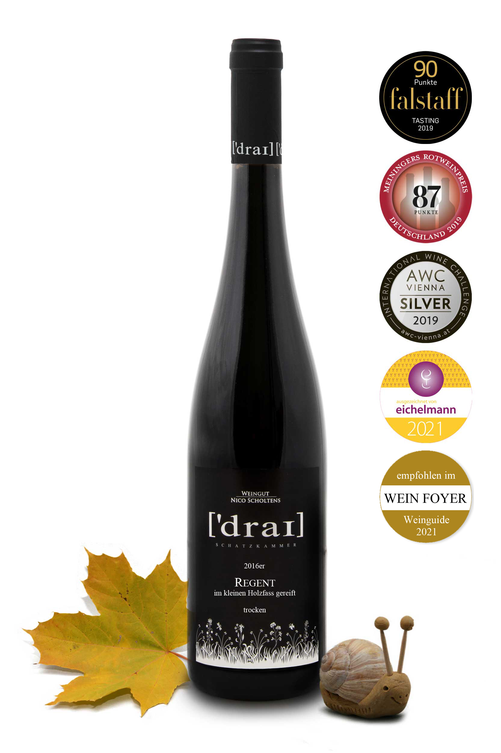 - empfohlen im Eichelmann Weinguide 2021: "Sehr gut ist auch der kraftvolle, intensive 2016er Regent"
