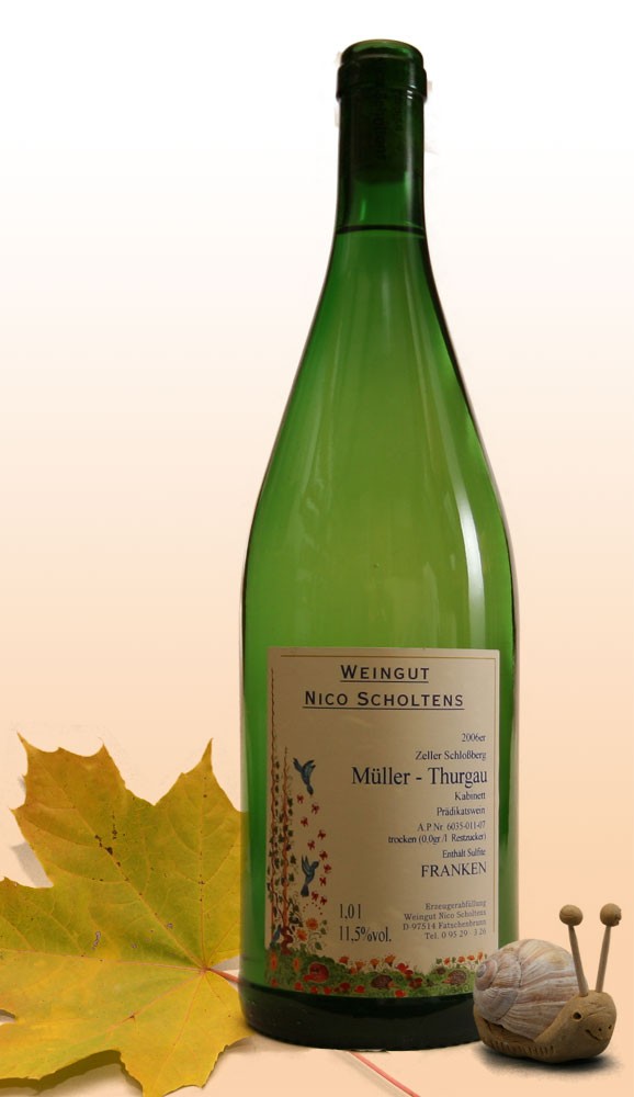Diese früh reifende Sorte hat lockere gelbgrüne Trauben und bringt leichte Weine mit angenehmen Muskatton hervor. Bereits als junger Wein lässt sich der fränkische Müller-Thurgau gut genießen. Typisch für ihn sind seine milde Säure, was ihn zu einem beliebten "Zechwein" macht. Als Synonym für Müller-Thurgau stößt man auch manchmal auf die Bezeichnung "Rivaner" - Müller-Thurgau und Rivaner sind aber ein und die selbe Sorte!